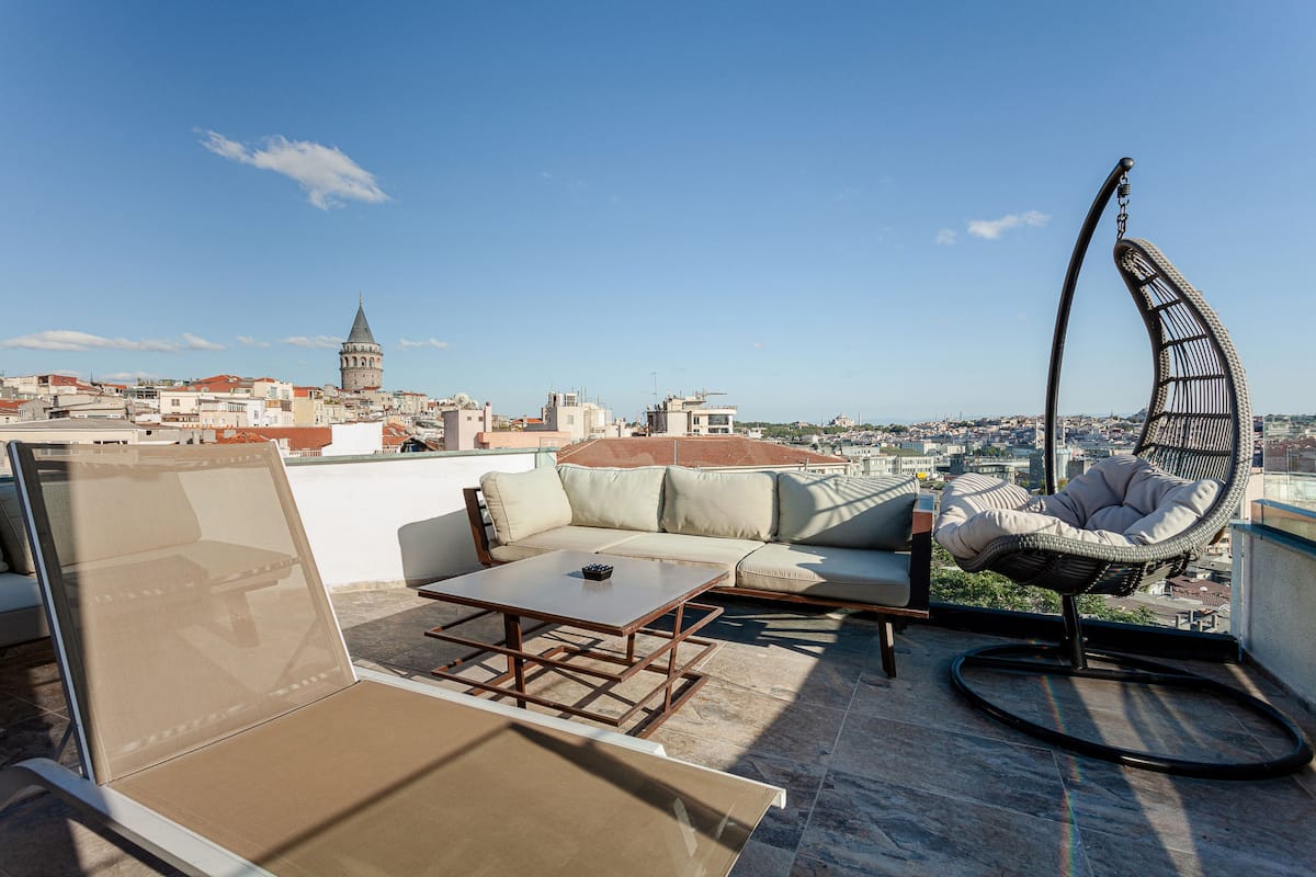 Located in the heart of Istanbul, this unique apartment offers one of the most captivating panoramas in the city, with sweeping views of the Historic Peninsula, Galata Tower, and the sea. Situated on the 5th floor and accessible by elevator, it features a spacious private terrace where you can enjoy the city’s charm from sunrise to sunset.